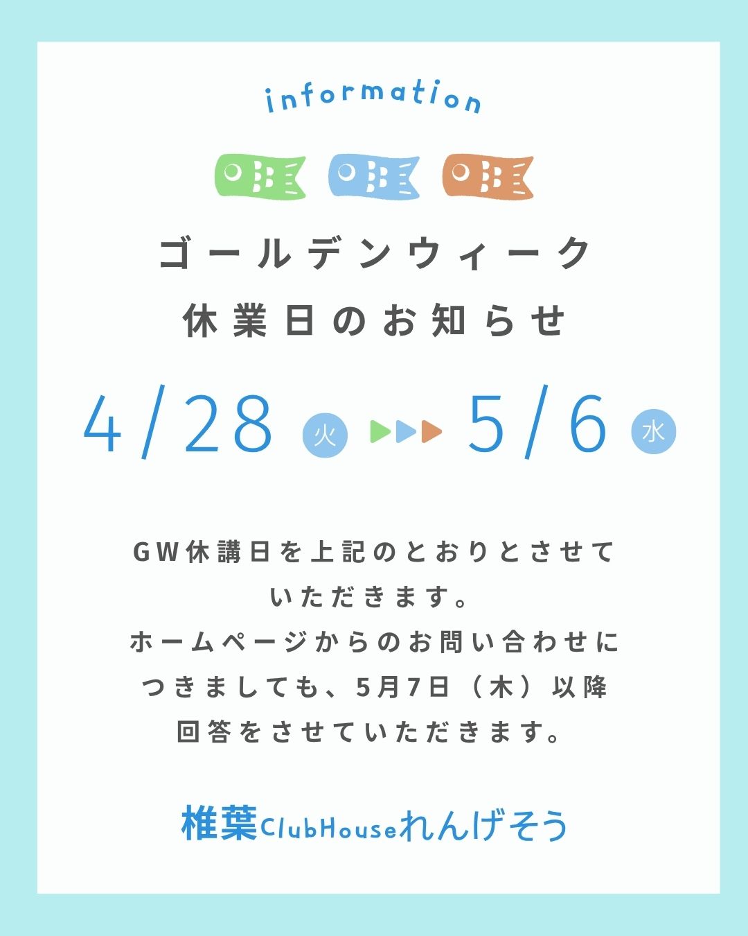 平素は格別のご高配を賜り、誠にありがとうございます。 椎葉ClubHouseれんげそうでは誠に勝手ながら、GW休講を下記のとおりとさせていただきます。 【GW休業期間:2026年4月28日(火)~2026年5月6日(水)…
